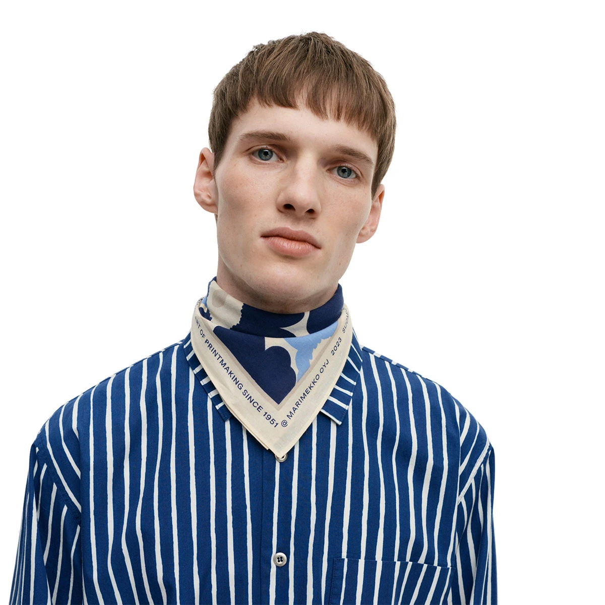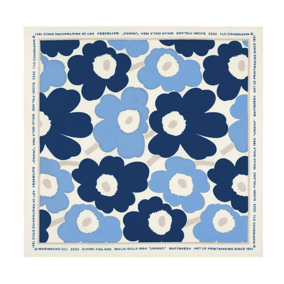 More about Marimekko Astrilli Unikko Light Blue / Navy ScarfWith Maija Isola’s timeless poppies, it’s impossible to be unfashionable. This 100% organic cotton scarf features the Unikko pattern in a light blue and navy colorway atop an off-white backdrop, ensuring both style and comfort. It’s versatile square shape allows you to wear it bandana-style, around your neck, or tied around the handle of a purse for a decorative touch. The Marimekko Astrilli Unikko Light Blue / Navy Scarf includes stitched edges and the iconic Marimekko print along each side.