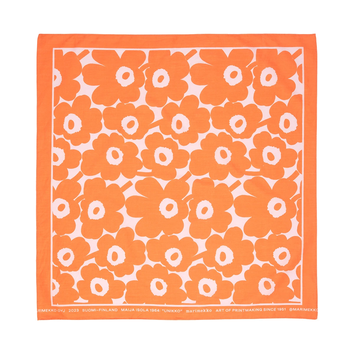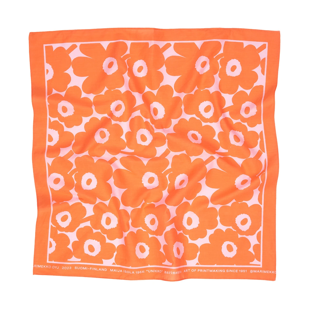 More about Marimekko Astrilli Unikko Orange / Pink ScarfThe Marimekko Astrilli scarf will add a much needed pop of color to your life. It’s bold and vibrant tones will top off any of your outfits, and it will quickly become a summer staple in your wardrobe with Maija Isola’s flowery Unikko (poppy) pattern featured atop. The Marimekko Unikko scarf includes soft cotton, a square shape and stitched edges with the Marimekko text along the bottom, mixing comfort and style seamlessly.