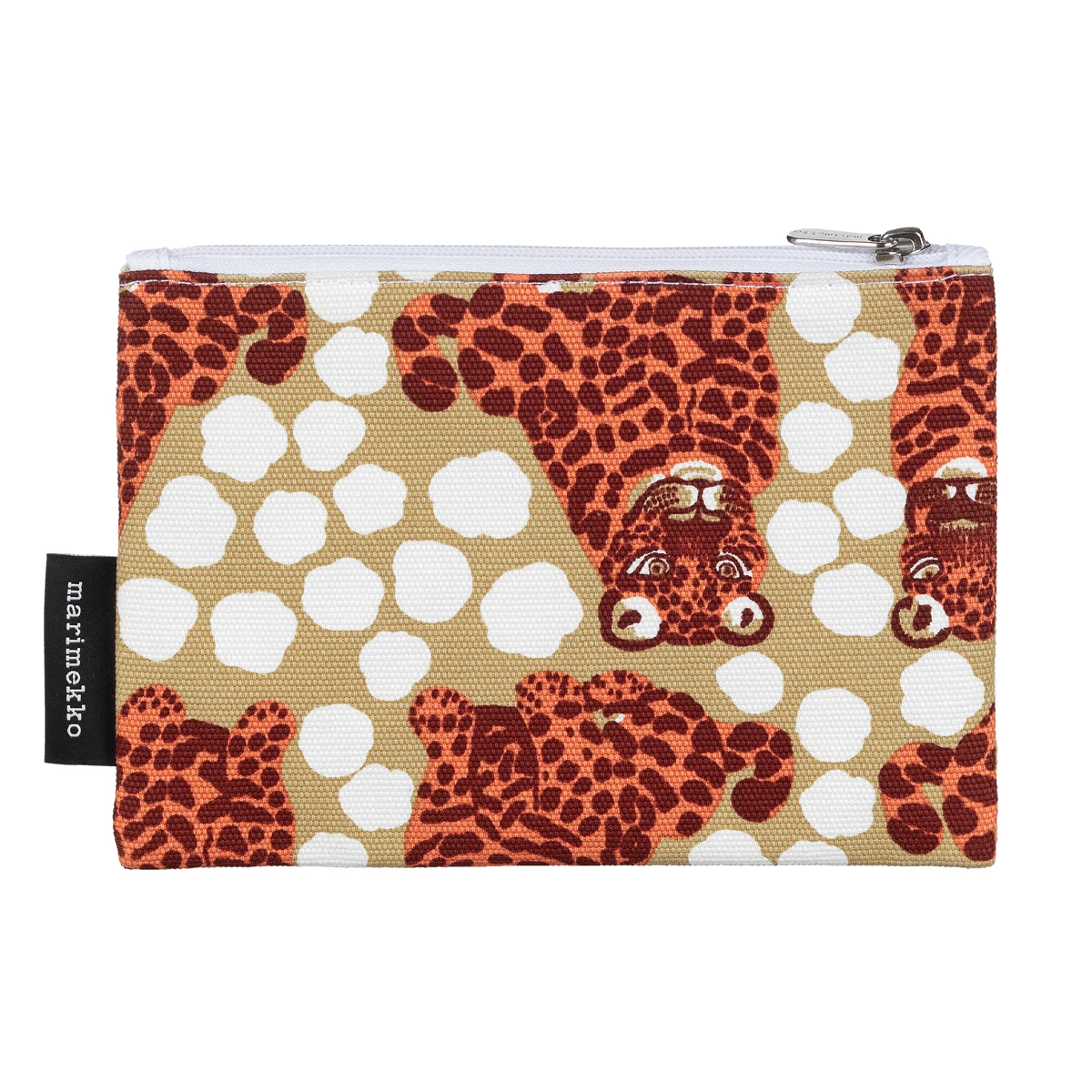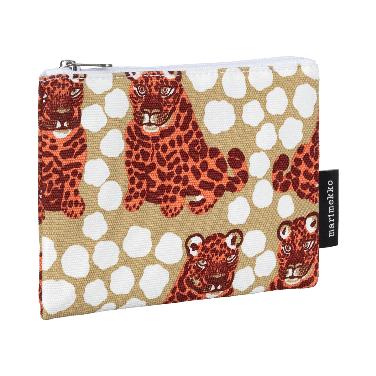 More about Marimekko Kaksoset Beige / Apricot / Maroon Kaika Zip PouchCalled Kaksoset (Twins), this features a mirrored pair of leopards atop a background of subtle spots like those which the wild cats wear. This animal print by Maija Isola eels as fresh as it did half a century ago when it was designed in 1970. It is featured on the Marimekko Kaika Zip Pouch, which is perfect for pencils, cosmetics, toiletries, and other odds and ends. The cotton exterior is durable and the black polyamide interior makes it easy to wipe clean in case of makeup spills. With the zip closure, you don