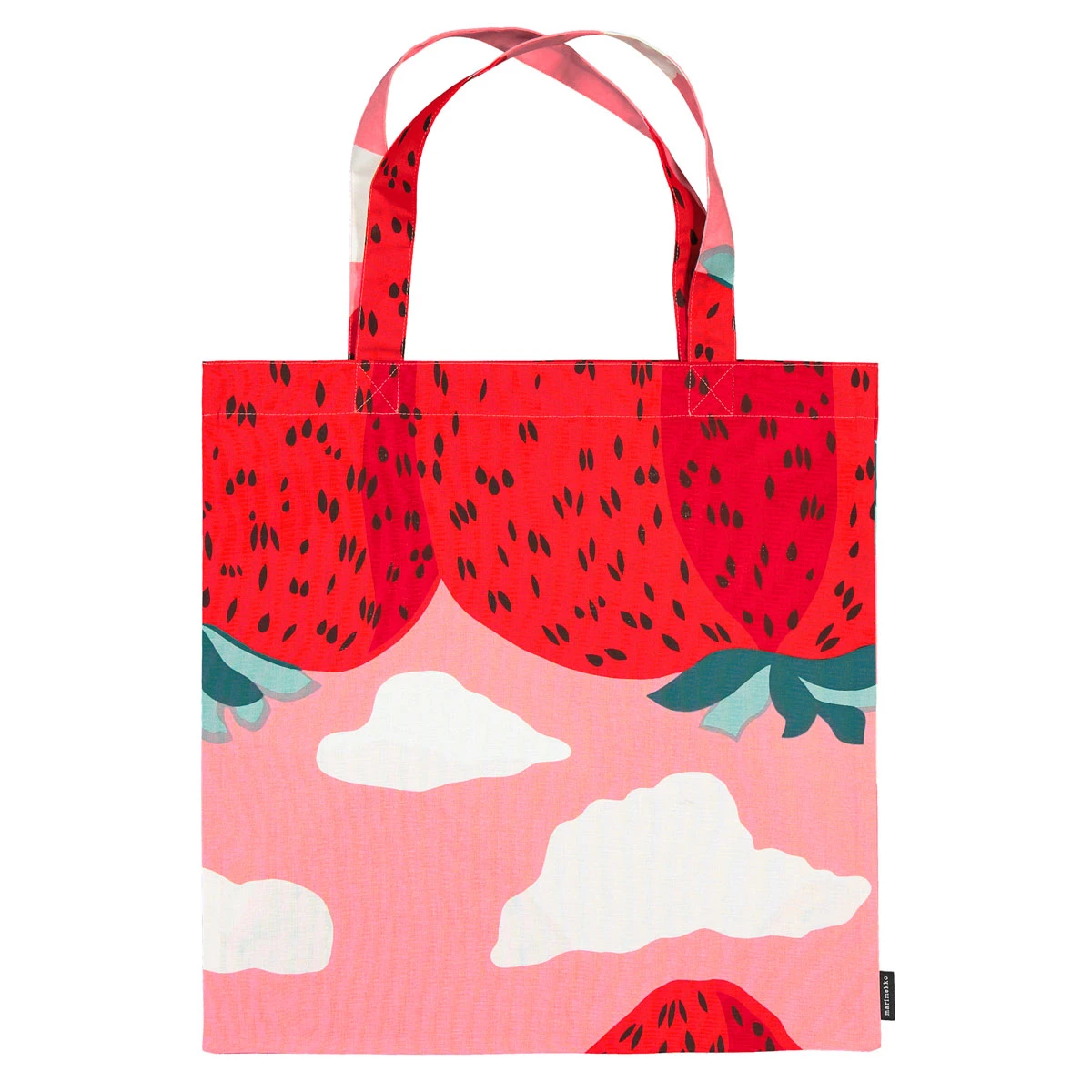 More about Marimekko Mansikkavuoret Pink / Red Tote BagFinnish for “Strawberry Hills”, the 1969 Mansikkavuoret pattern was designed by Maija Isola in 1969. Two years prior, the songs “Strawberry Fields” and “Lucy in the Sky with Diamonds” were released and inspired this delicious design. The strongly saturated colors and pop art imagery feels as fresh as it did during the peak of its popularity in the late ’60s. Here, it’s featured on a 100% cotton tote perfect for bringing home your own fresh fruit from the farmers market. Machine washable, it also works well for bringing a towel and sunscreen to the beach.