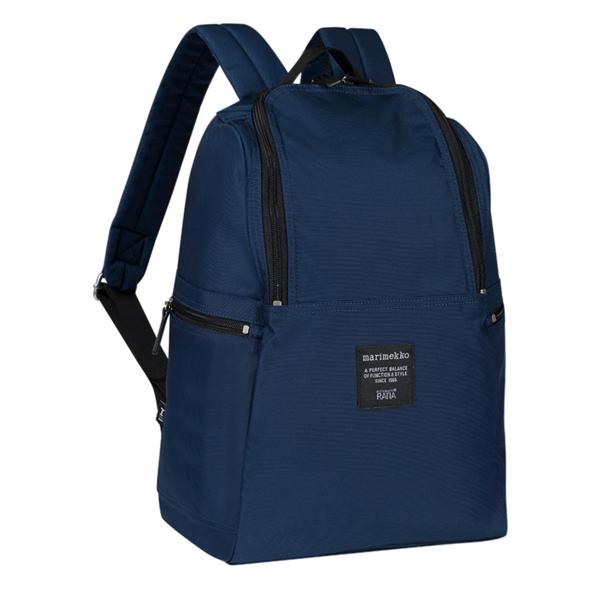 More about Marimekko Metro Night Blue BackpackPhones, tablets, laptops; we have a lot to carry these days, and the Marimekko Metro can accommodate it all. The front flap opens to reveal a mesh zippered side pocket, as well as another separate pouch just below. Inside, the main compartment is divided into two roomy sections, one of which has a Velcro tab to protect valuables from moving about on a bumpy bike ride. The navy “night blue” 100% nylon exterior has two zippered side pockets, as well as a hidden back pocket perfect for keeping a wallet safe. The sturdy, adjustable straps on this travel veteran promise a safe and comfortable journey even for heavier items. On the outside of this built-to-last bag is a woven Marimekko tag that sums it all up; “a perfect blend of function & style since 1966.”
