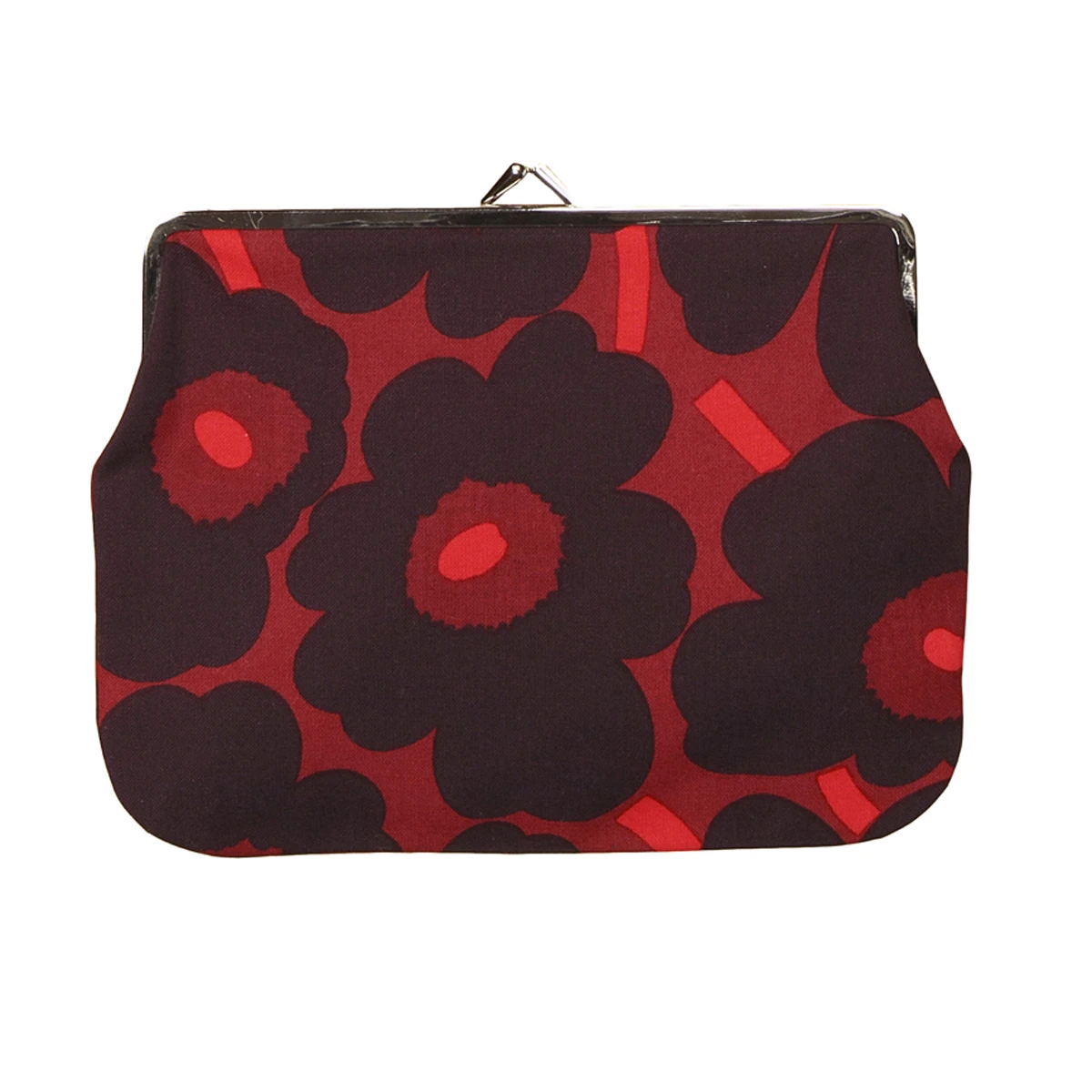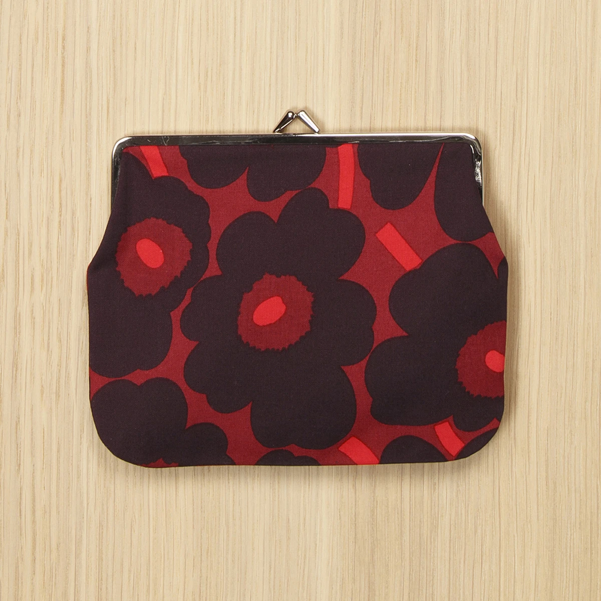 More about Marimekko Mini Unikko Red / Plum Large Coin Purse This red and plum mini unikko pattern coin purse is great for stashing miscellaneous items on the go. It is large enough for cell phones, sunglasses, credit cards, tissues, snacks; whatever you keep in this printed pouch, you’ll be able to spot it and retrieve it in a flash. The 100% cotton carrier has a metal clasp that snaps open to reveal a twill lining and snaps shut closed to keep everything secure.