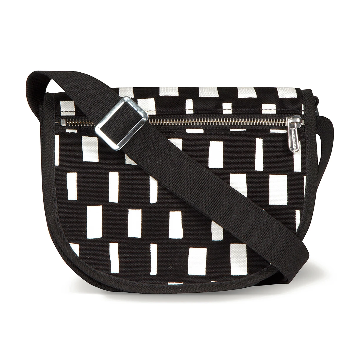 More about Marimekko Noppa Black / White Kerttu Shoulder BagThis semicircular shoulder bag made of heavyweight cotton canvas with a Noppa (Dice-like pattern) has two interior compartments, one with a zip top closure, and an adjustable shoulder strap. The cover flap secures with a magnetic closure and has a zip pocket. It measures 8.5” wide x 6” tall x 5.5” deep.