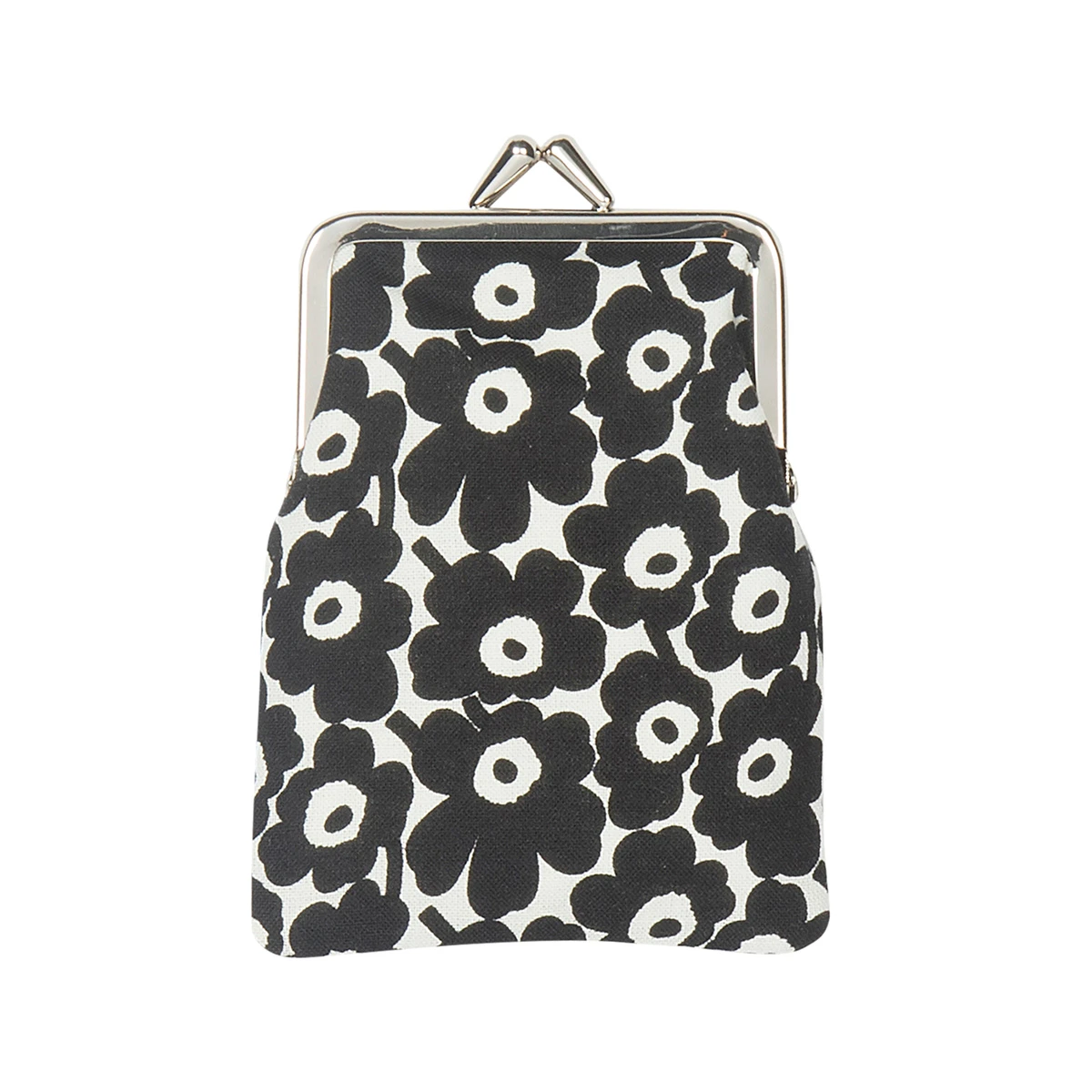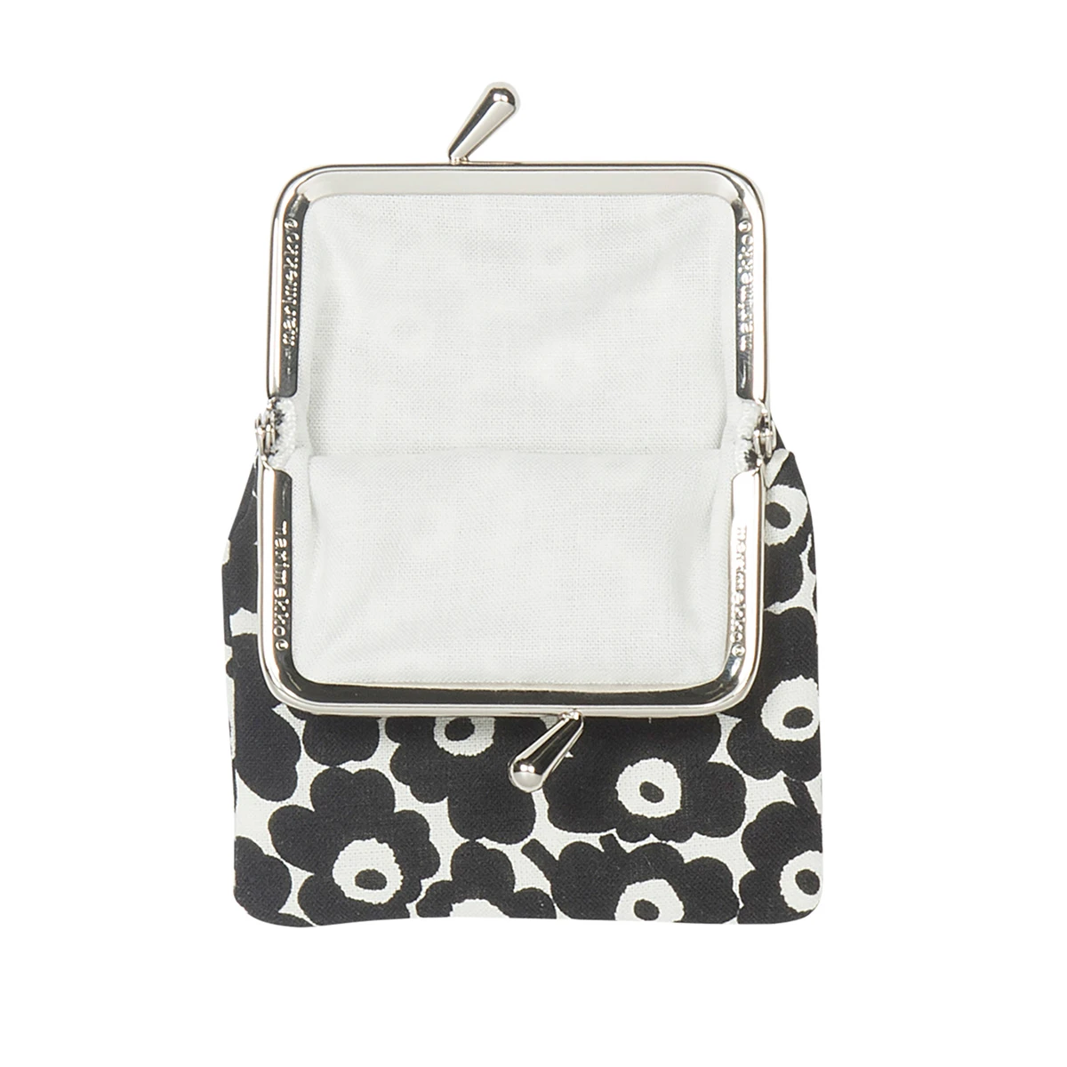 More about Marimekko Pikkuinen Unikko Ivory / Black Small Coin PurseCarry your mini must-haves with ease in this pretty coin purse. The metal clasp snaps keep cash, cards, or lip balm safe yet within easy reach. The durable, washable 100% cotton bag features the famous poppy print called Unikko by Maija Isola in a scaled-down size. The Marimekko pattern is as timeless as it was during its release in the 1960’s, and is neutral in shades of ivory and black.