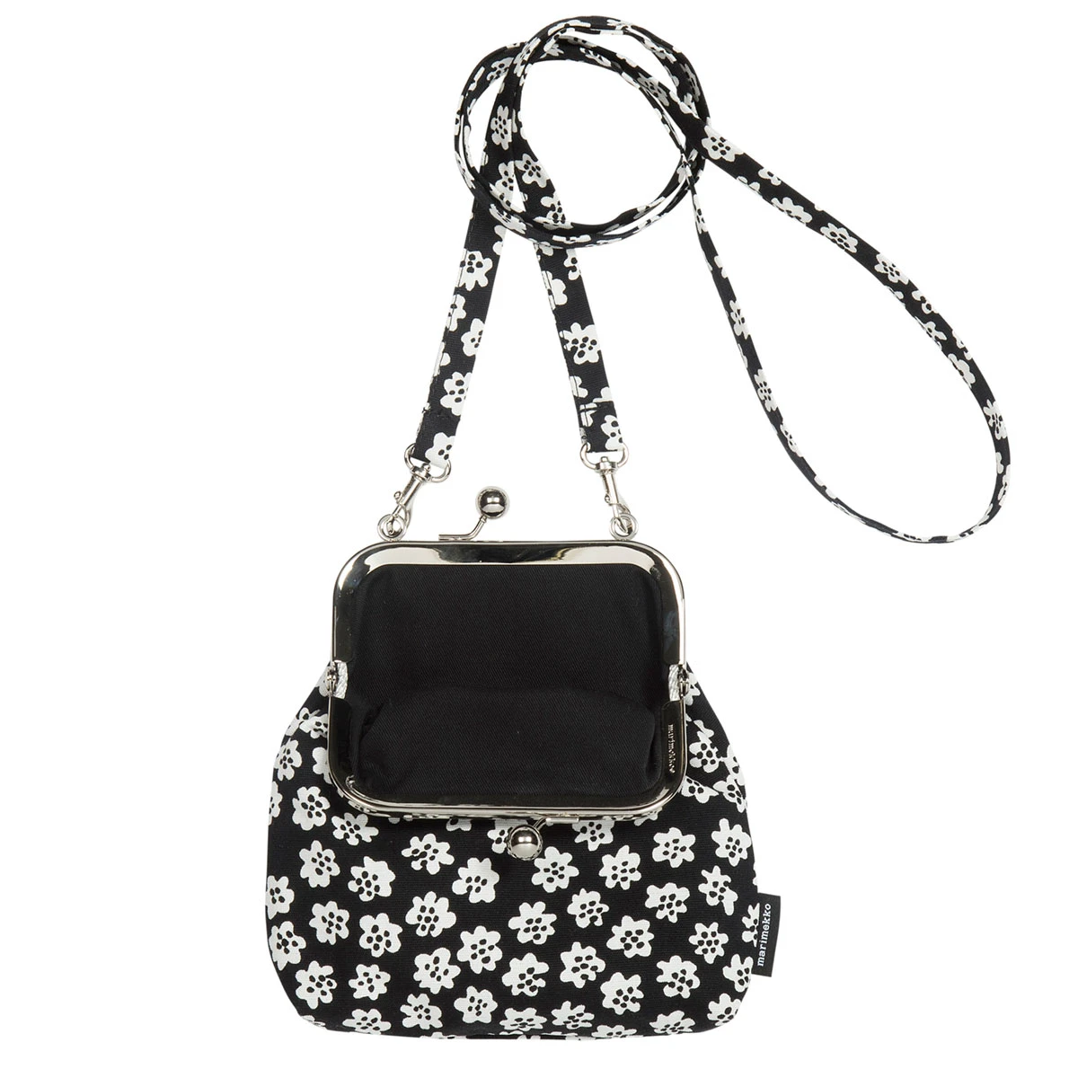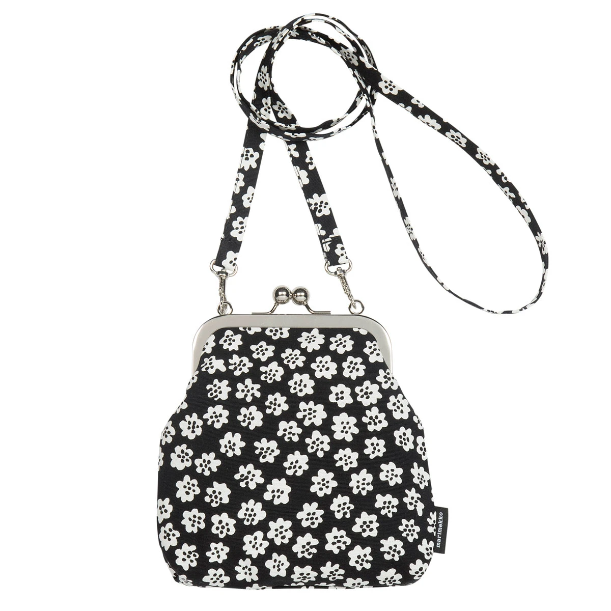 More about Marimekko Puketti Black / White Roosa PurseA little purse with a big twist; the Marimekko Roosa has a metal clasp that gives it the look of a coin purse and a long strap that allows it to be worn as crossbody. Made from 100% cotton, the bag is lightweight and perfect for a person the on go who has a few key essentials to carry. The strap can also be removed, so it can be put in a larger purse or tote bag when you have more to carry. Puketti, Finnish for bouquet, was one of Annika Rimala’s earliest design contributions to Marimekko. The clusters of tiny white flower heads add a sweet yet simple style to the accessory.