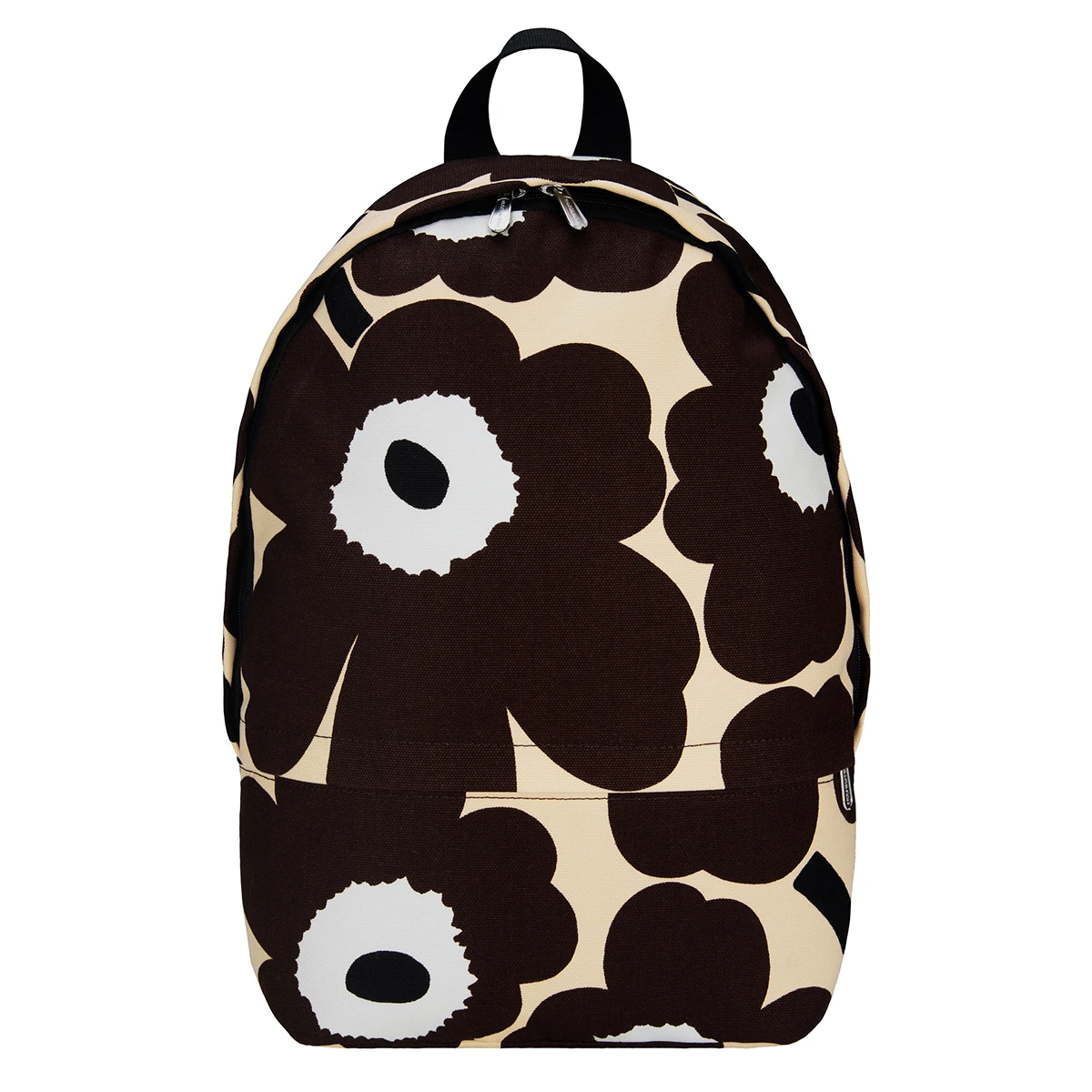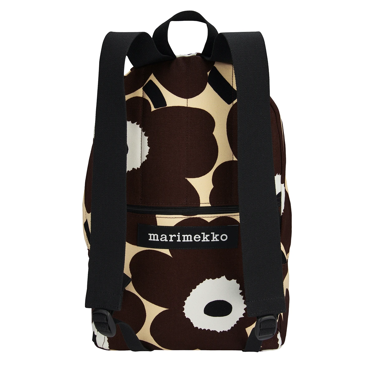 More about Marimekko Unikko Beige / Brown Enni BackpackBackpacks have enjoyed a recent resurgence for their convenient carry and youthful feel, but Marimekko the classic sillhouette has always been a mainstay for Marimekko. This zip top backpack is made from cotton canvas covered in Maija Isola’s Unikko pattern saturated in shades of beige, brown, black, and ivory. Adjustable shoulder straps and a padded back slot pocket ensure comfort for every wearer. Interior and exterior zip pockets provide a spot for your things big and small, from weekend trip to daily errands. The back exterior proudly sports a sewn Marimekko logo label.
