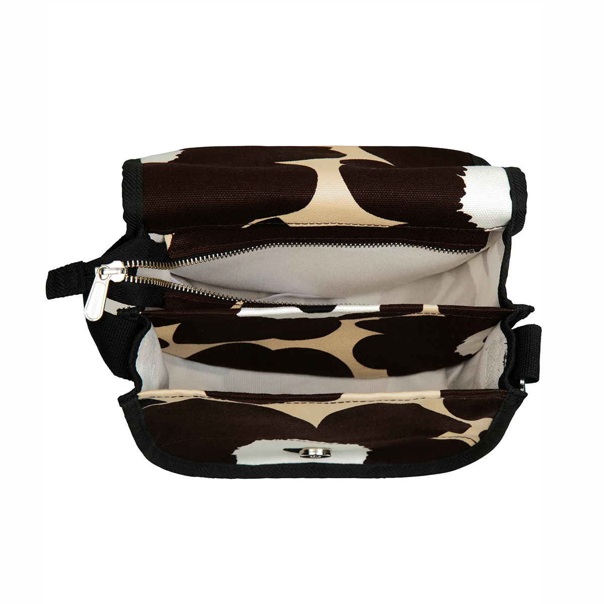 More about Marimekko Unikko Beige / Brown Kerttu Shoulder BagCarry all your little essentials with the Marimekko Kerttu Shoulder Bag. Two roomy interior pockets, one with a zipper closure, are perfect for your wallet, keys phone and more. A cover flap secures the purse with a magnetic snap and features an outside zipper pocket, perfect for things you want on-hand. Made of sturdy, 100% cotton canvas, the exterior is patterned with the famous Unikko pattern in beige, brown, ivory, and black.