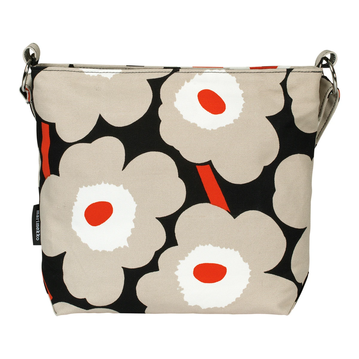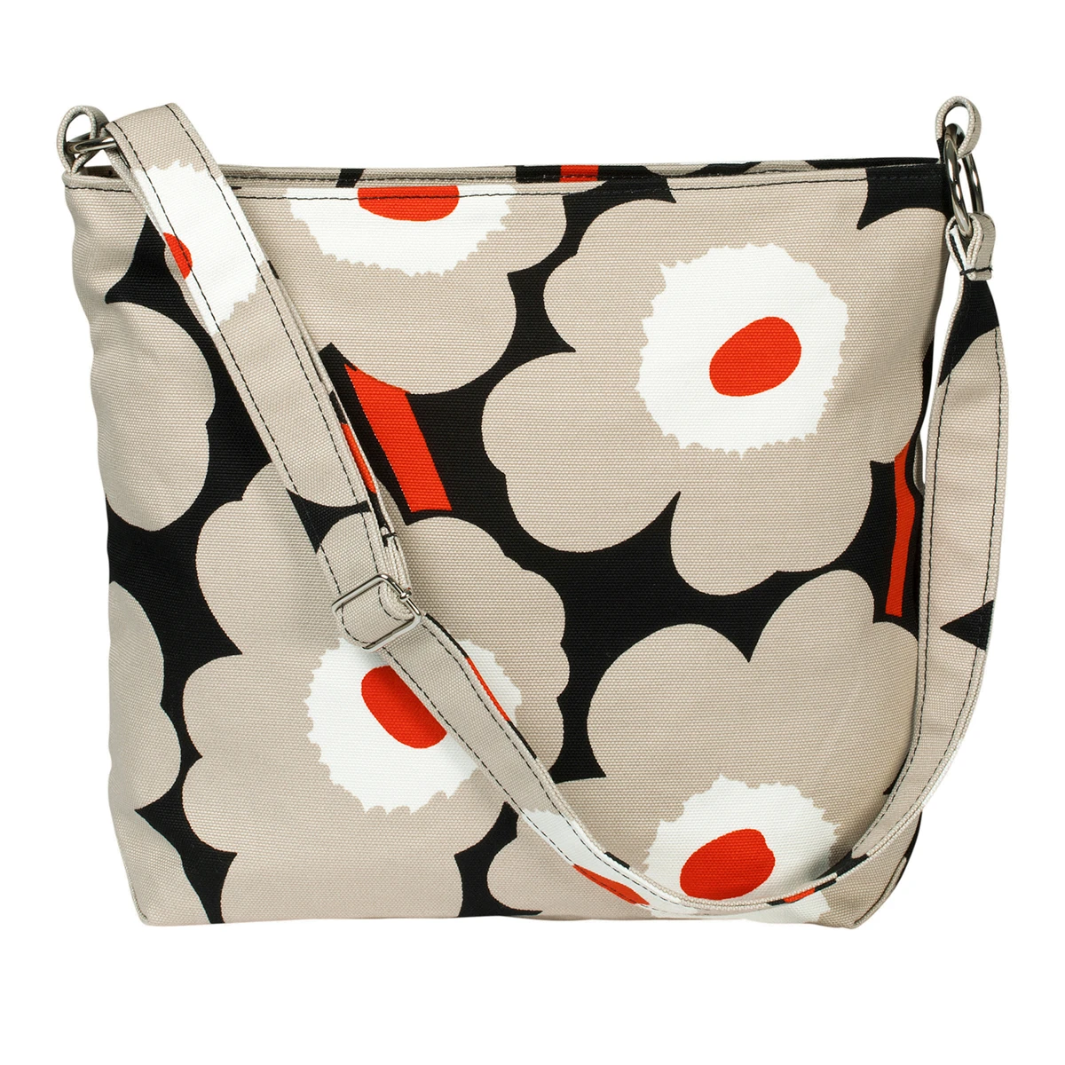 More about Marimekko Unikko Black / Beige / Orange Venni Shoulder BagCarry everything in convenient style with the Marimekko Venni. Open the value closure to reveal a roomy interior with on open pocket to store those little, loose essentials. An adjustable shoulder strap allows it to be worn as a crossbody or shoulder bag. The 100% cotton canvas exterior is printed with Maija Isola’s famous 1964 Unikko (Poppy) print in eye-popping shades of black, beige, white, and orange.