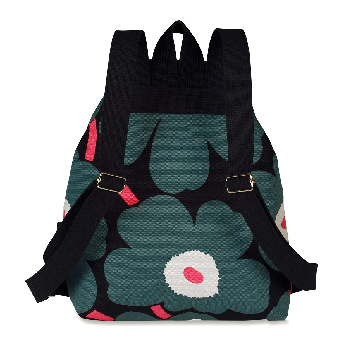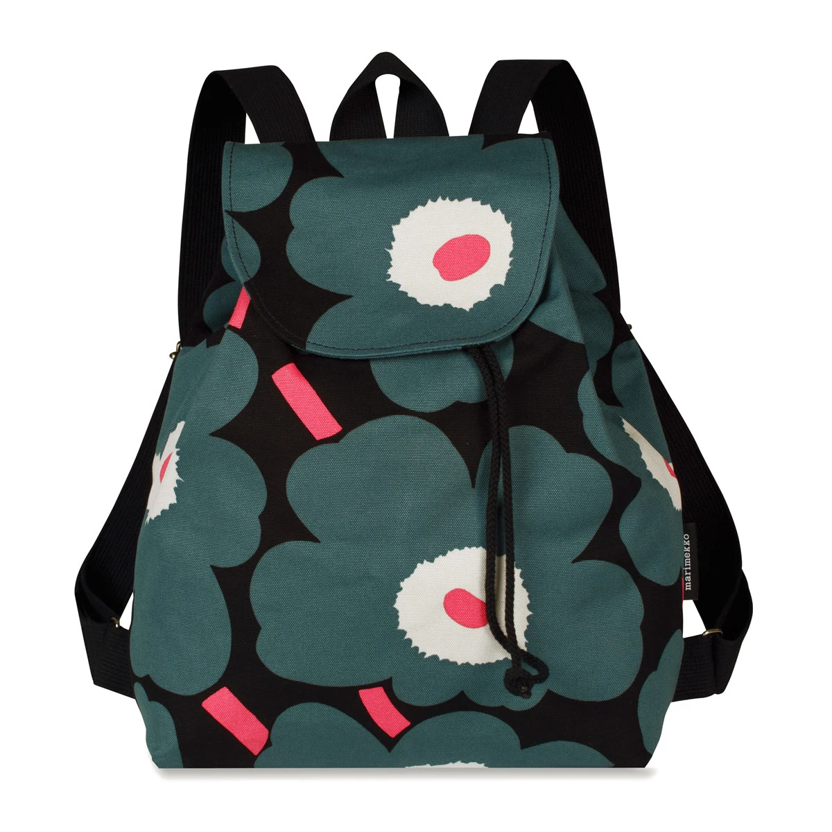 More about Marimekko Unikko Black / Pink Erika BackpackSet off on an adventure in smart style with the Marimekko Italia Erika Backpack. Maija Isola’s iconic Unikko print is striking in black, pink and green on this 100% canvas cotton carrier. The backpack has a drawstring top and magnetized front flap closure. The shoulder straps are adjustable and an interior zip pocket will keep items like keys, change and your phone easily accessible and secure.