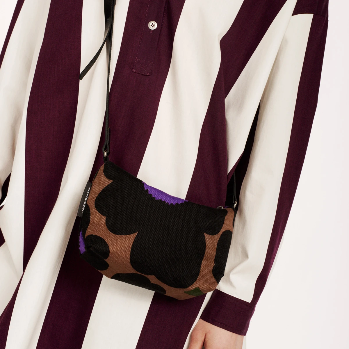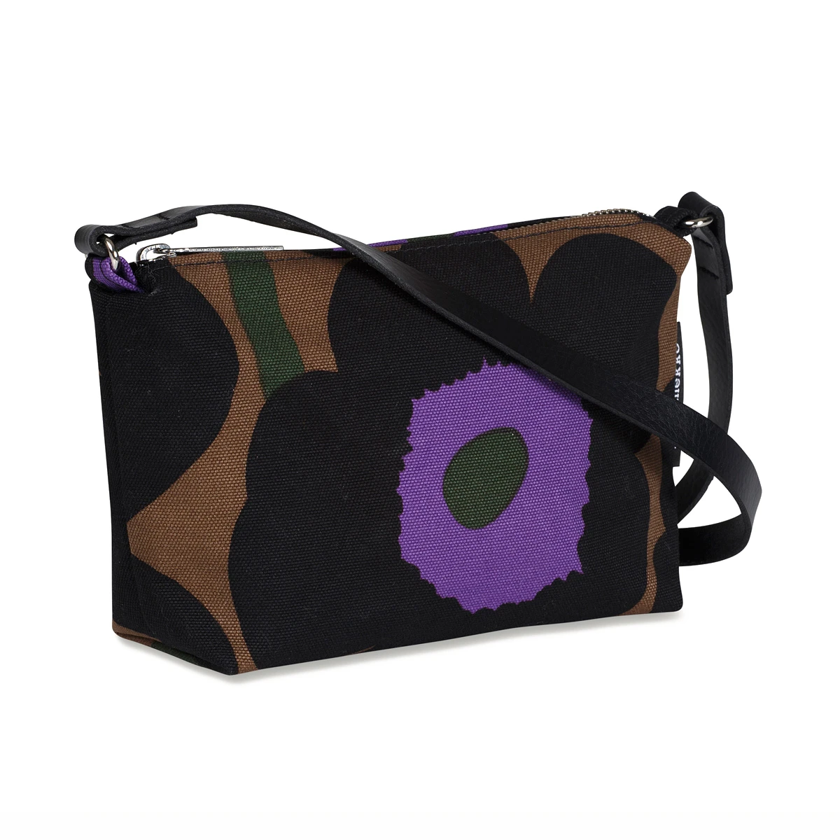 More about Marimekko Unikko Brown / Purple / Black Heli BagDare to be different with bold and unexpected colors this season. Black, purple, and green poppies grace a brown backdrop to create a unique fall color scheme. The famous 1964 Unikko pattern by Maija Isola has proven timeless, just as this bag will prove to be a long-lasting favorite. Adjustable by means of a silver buckle, the long black leather strap allows the cotton canvas bag to be worn as a shoulder or crossbody bag for the ultimate versatility.