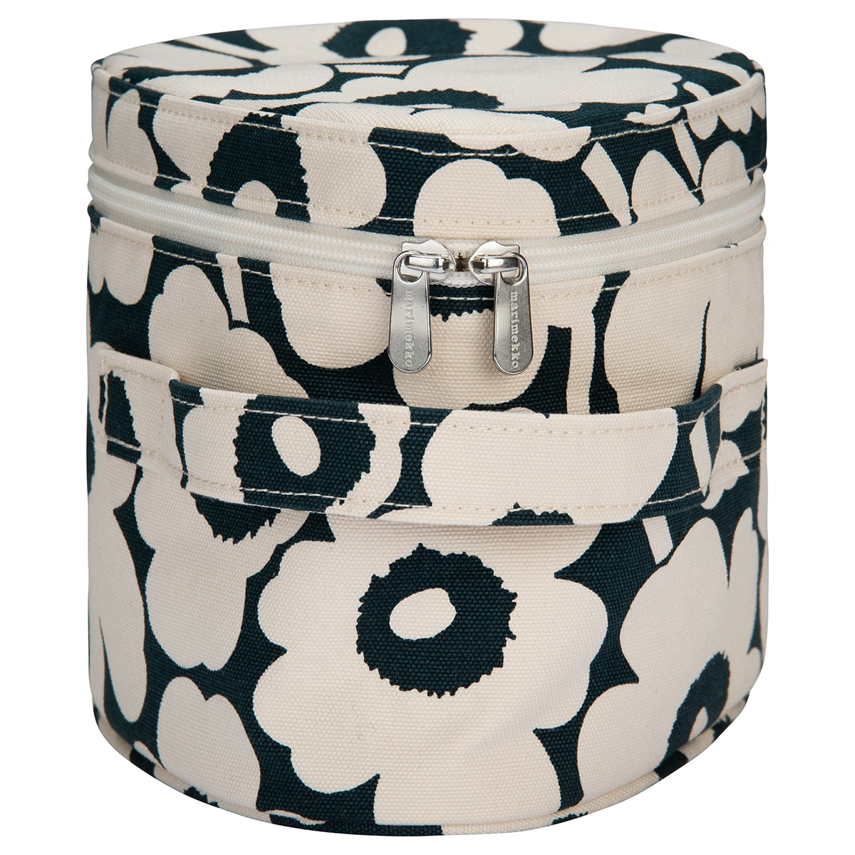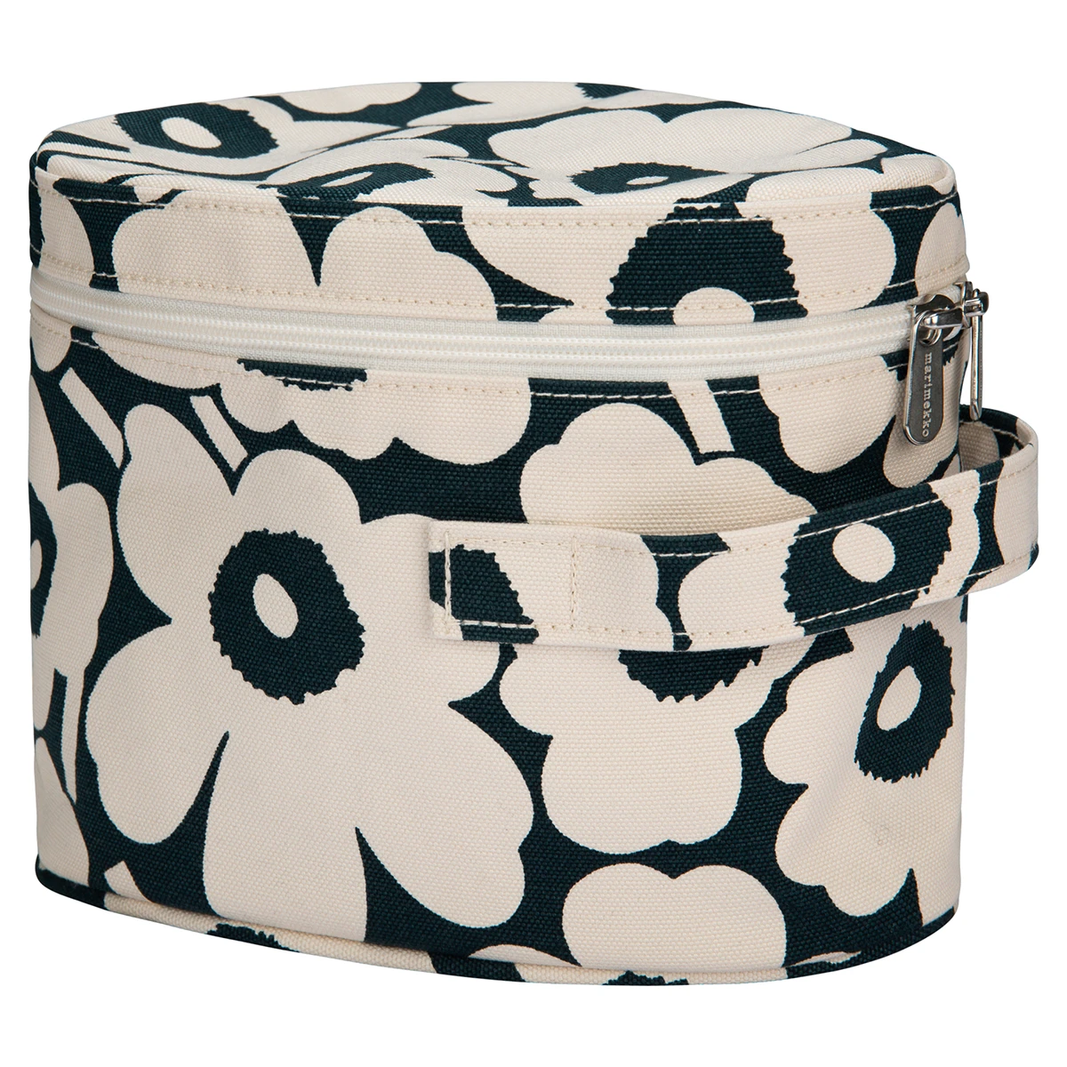 More about Marimekko Unikko Green / Beige Vuolu Cosmetic BagThis round cosmetic case can hold quite the haul for you or the self-proclaimed product fanatic in your life. Functional features include a outer handle, zipper closure, as well as pockets-a-plenty (two open, one zippered on the lid). The shape was inspired by natural stones, so the deep forest green and light beige colorway follows suit. The heavyweight cotton canvas exterior is handsome for a permanent spot in the bathroom or for travel. Inside, a nylon lining makes messes easily wiped clean; though the entire bag can be machine washed for more serious spills.