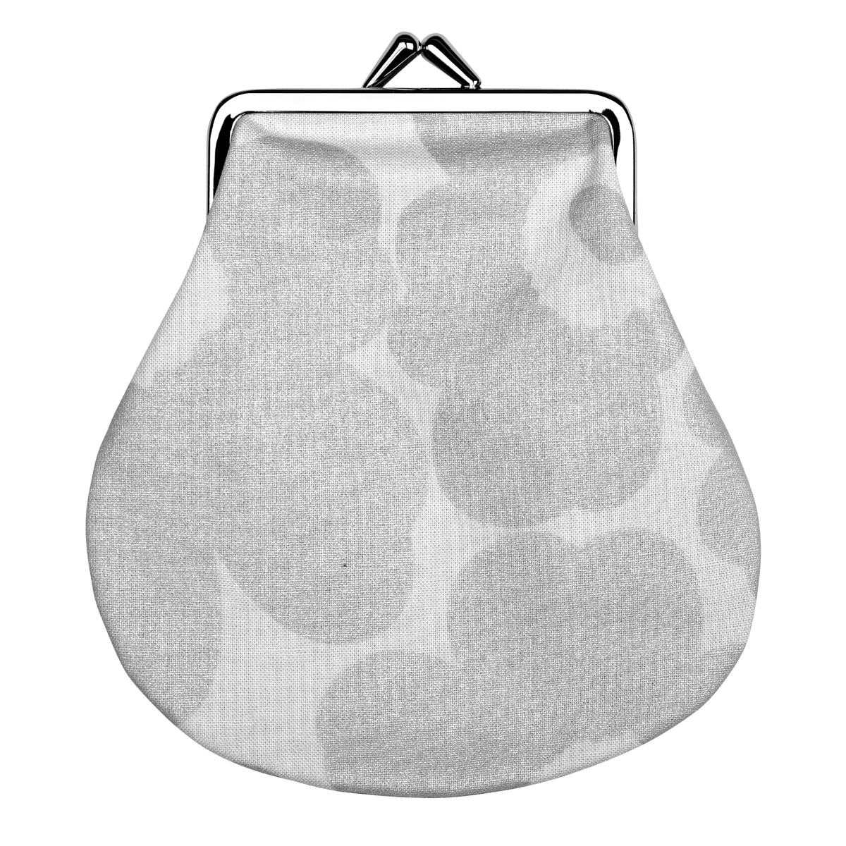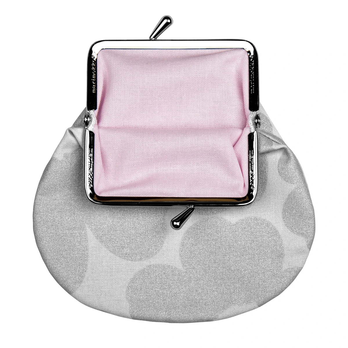 More about Marimekko Unikko Grey / Silver Coin PurseTuck your treasures in a classic coin purse with Maija Isola’s 1964 poppy print, “Unikko.” The metal clasp opens to reveal a surprisingly roomy pink interior for loose change, cash, cards or cosmetics. The cotton exterior features the famous flowers in wintry shades of grey and silver, and pictures don’t do the metallic shimmer justice. It opens and closes with a metal clasp, true to its retro nature.