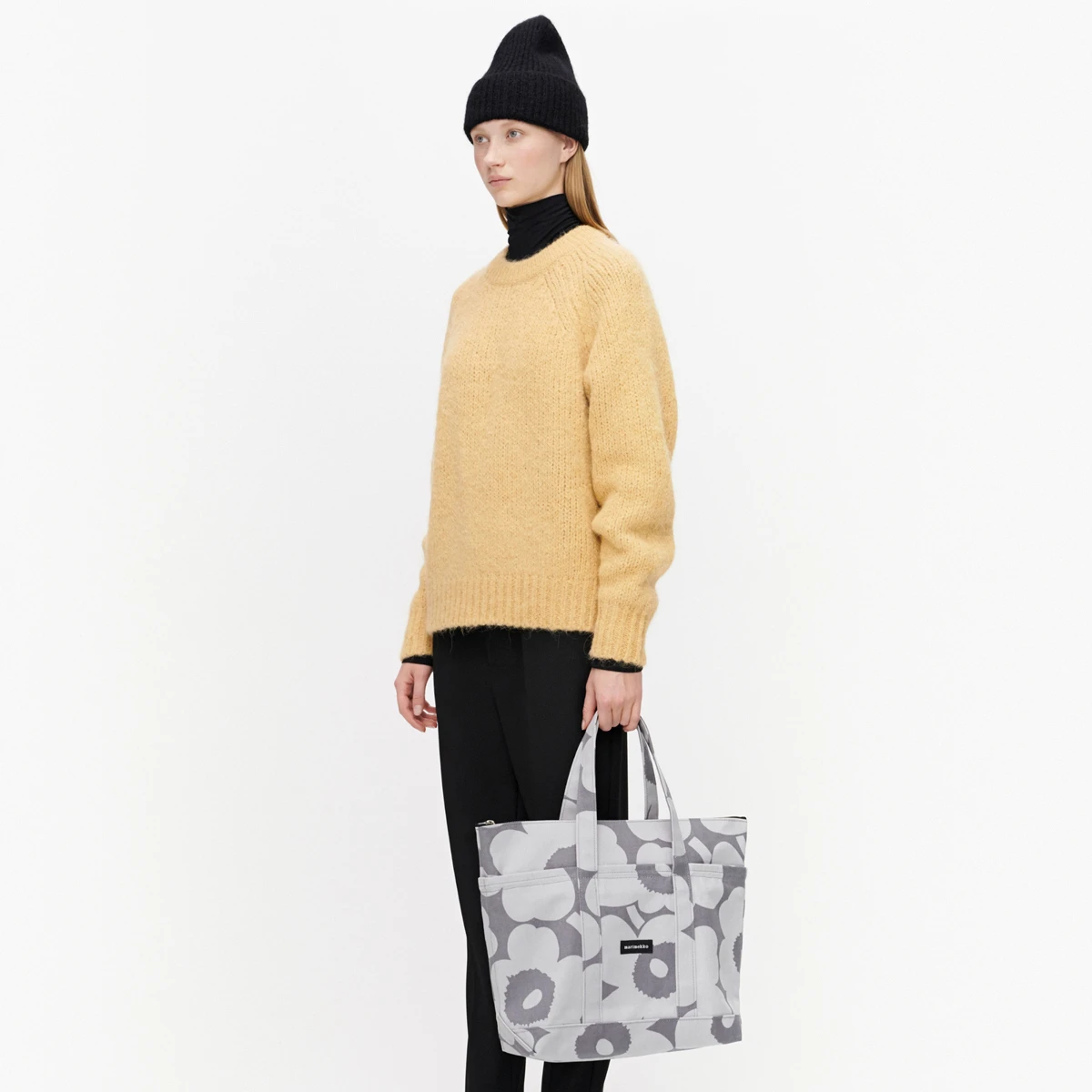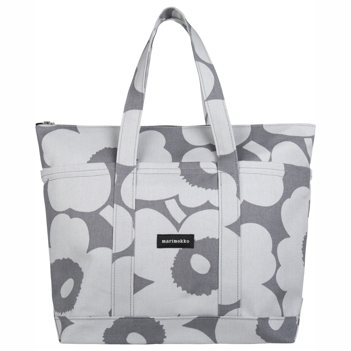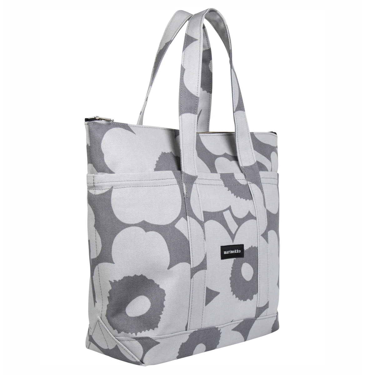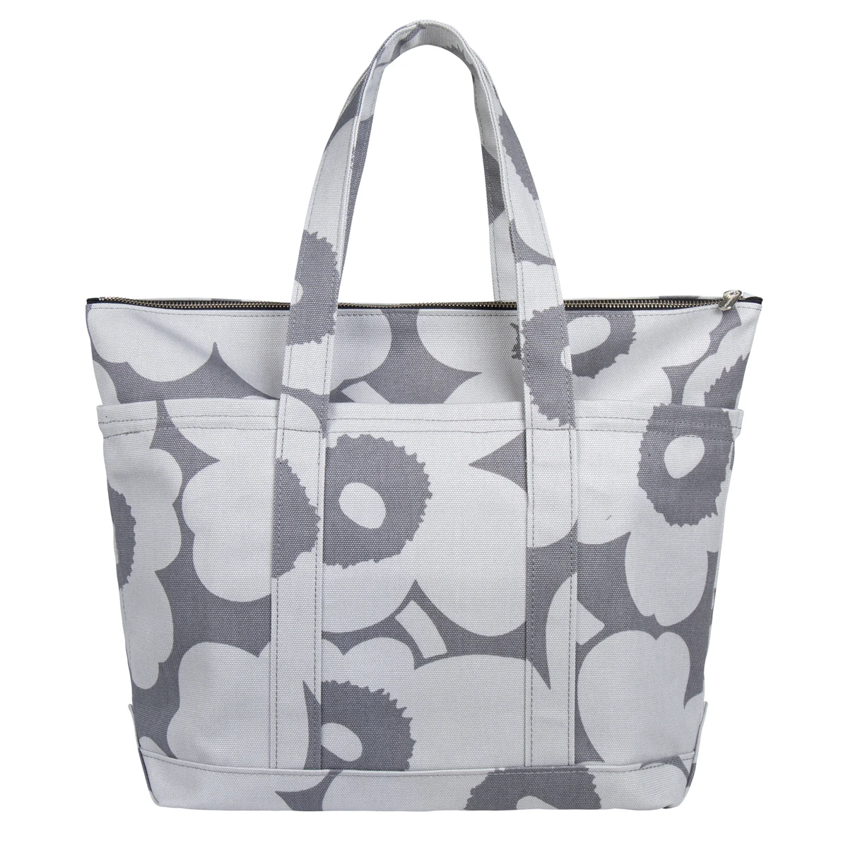 More about Marimekko Unikko Grey / Silver Uusi Mini Matkuri BagPack up the Marimekko Uusi Mini Matkuri (New Mini Traveler) Bag with all the essentials for a weekend adventure. Made of sturdy cotton canvas, this heavy-duty bag is both durable and lightweight. Tote it by its two reinforced handles. The roomy interior features a zippered pouch and two pockets, making it easy to stay organized while carrying more than one day’s supplies. It feature’s the famous poppies by Maija Isola in wintry yet neutral shades of grey and silver for a modern, minimal, and monochromatic look.