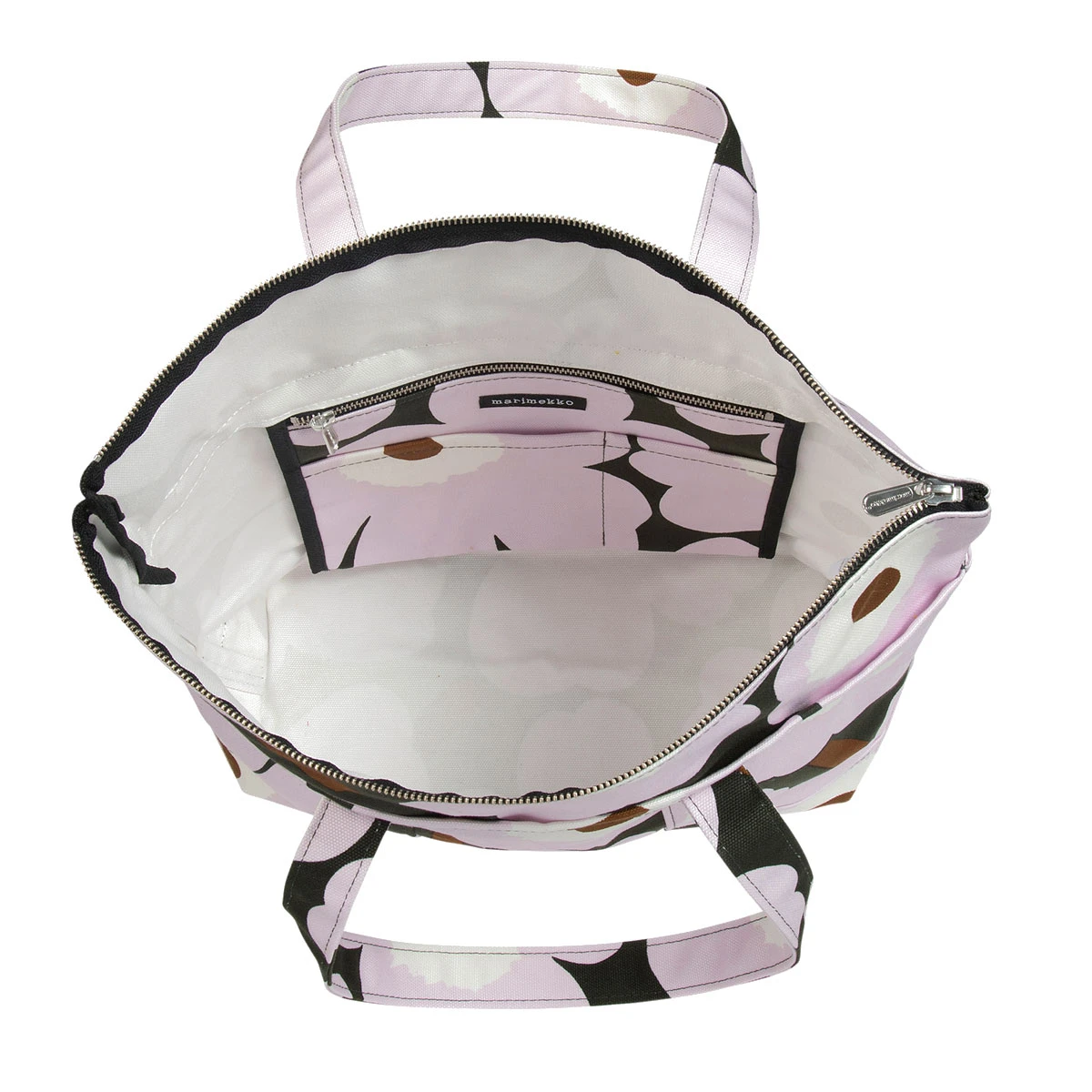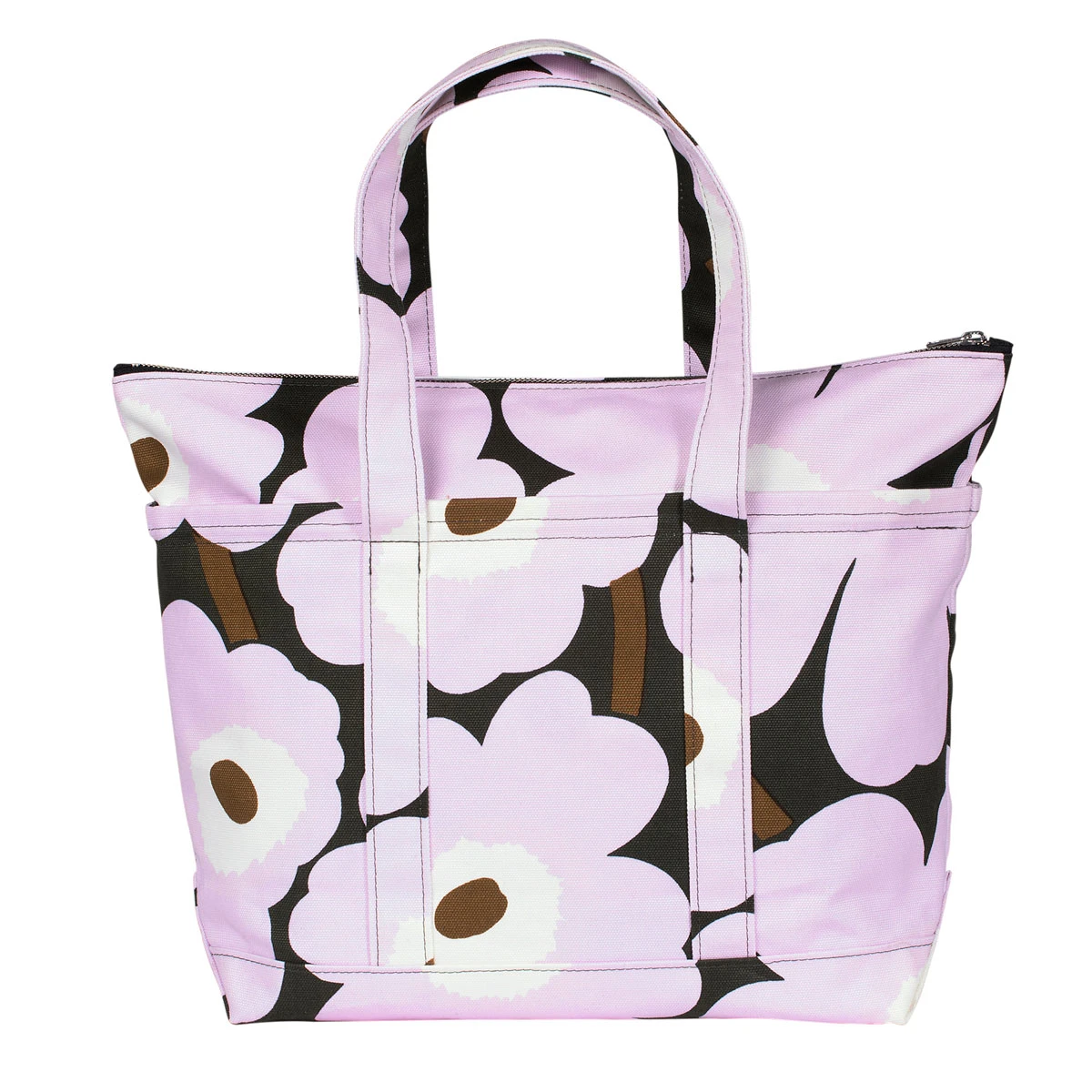 More about Marimekko Unikko Lilac / Brown Uusi Mini Matkuri BagPack up the Marimekko Uusi Mini Matkuri (New Mini Traveler) Bag with all the essentials for a weekend adventure. Made of sturdy cotton canvas, this heavy-duty bag is both durable and lightweight. Tote it by its two reinforced handles. The roomy interior features a zippered pouch and two pockets, making it easy to stay organized while carrying more than one day’s supplies. It feature’s the famous poppies by Maija Isola in spring shades of lilac, white, and brown. The background color is the darkest of greens, just a shade above black. It’s symbolic of the life sprouting from the bout of darkness during winter’s visit.